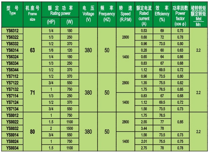 機(jī)座號:63~90 功率:1/4~10HP(0.18~1.1KW) 電壓:220/380V 頻率:50/60Hz